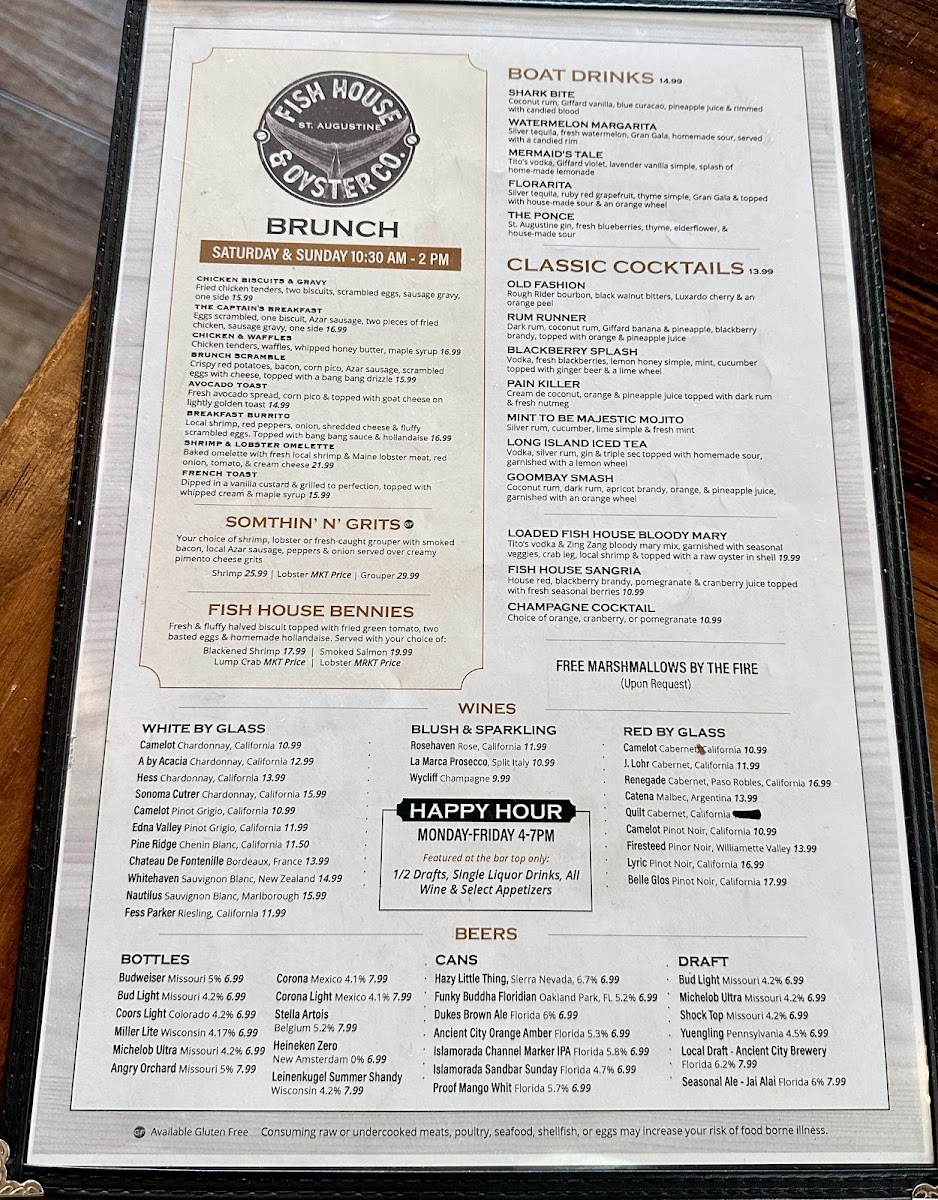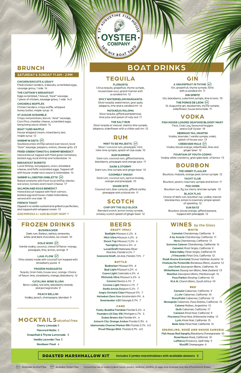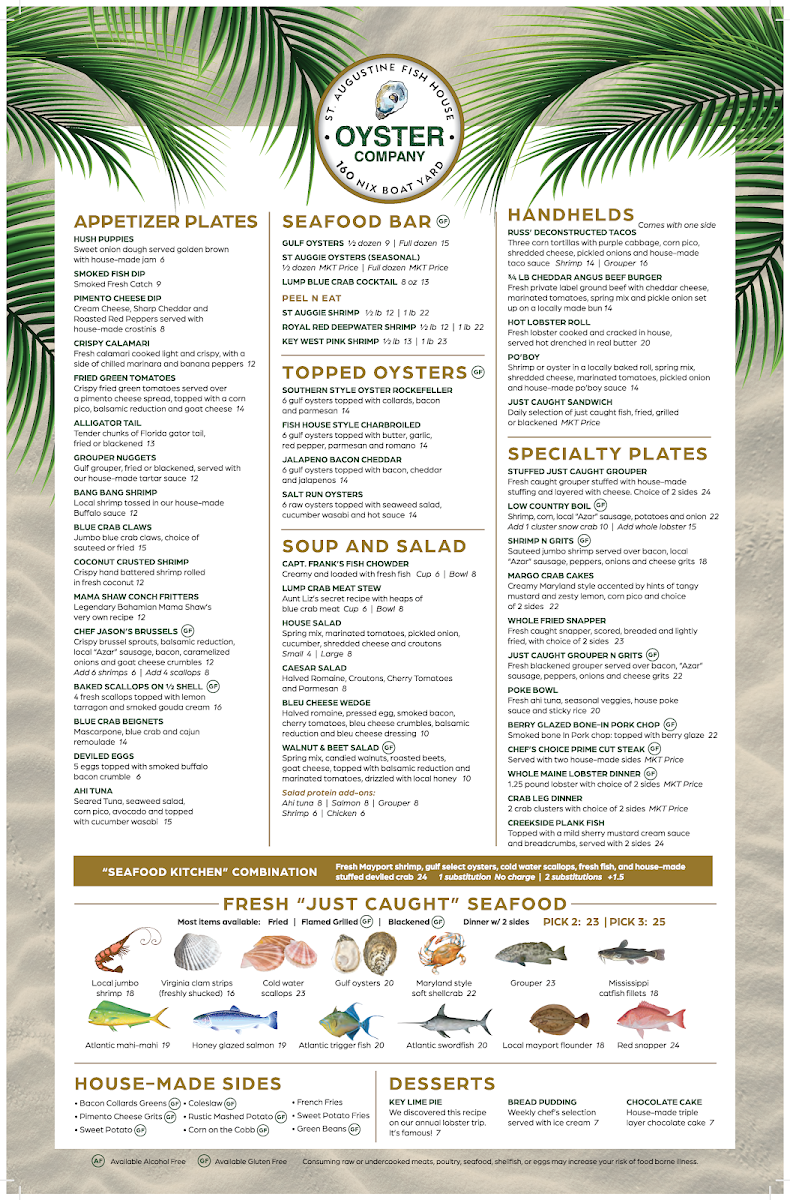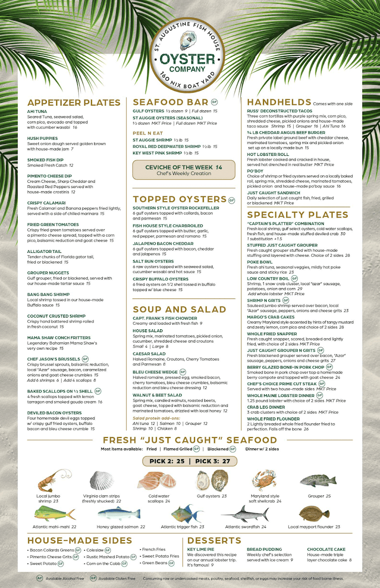 If you're craving fresh seafood in a laid-back atmosphere, look no further than St. Augustine Fish House & Oyster Company Menu. Nestled at 160 Nix Boat Yard Rd, St. Augustine, this inviting spot offers an exceptional variety of ocean-inspired dishes, perfect for any seafood lover. From oysters straight from the coast to flavorful fish dishes, the menu is a celebration of local, sustainable ingredients. Whether you're in the mood for a light bite or a hearty meal, there’s something here to satisfy every craving. Pair your meal with a refreshing drink from the bar and enjoy the cozy, welcoming vibe that makes this place a must-visit in St. Augustine.